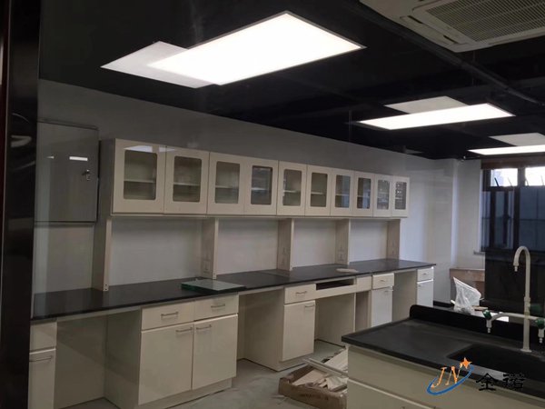 对化学实验室,一般能接受的装有试剂架的实验台宽度,靠墙实验台为2英尺6英寸,半岛式实验台为5英尺。对物理实验室,推荐采用3英尺,有时有阔的电子设备时采用6英尺的宽度。对某些实验室,2英尺或2英尺3英寸的实验台宽度已足够。当台面用厚木料,考虑宽度与造价的关系就相对地不重要了,但当用成品板材时,宽度应结合板材尺寸加以考虑,使材料损耗减少到最小的程度。