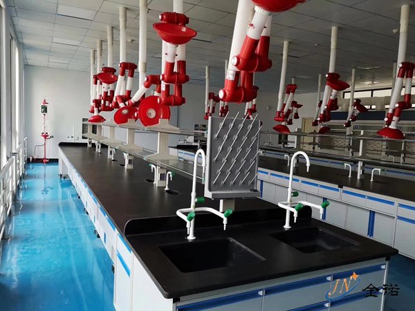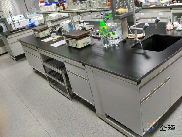 金诺根据化学实验室配置实验设备:实验室边台、中央台(水槽、试剂架)、通风柜、药品柜、器皿柜、回流冷凝装置(小水杯及水拷克)、抽滤装置(抽滤水龙头、小水杯槽)。