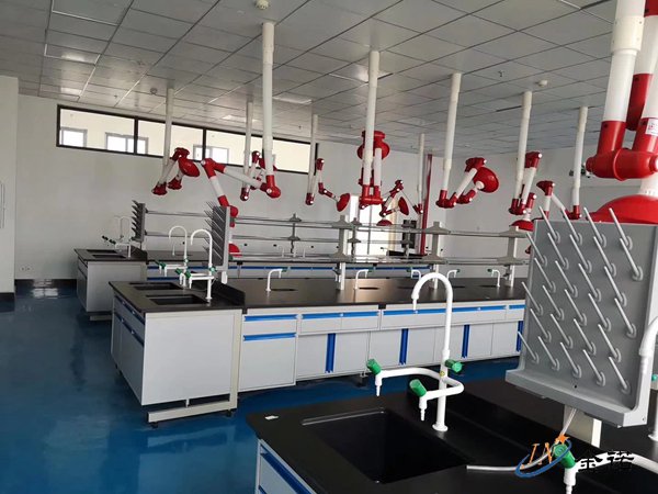 17.双口鹅颈冷热水化验龙头:采用欧美进口铜制立式双口鹅颈化验龙头,表面经耐酸碱EPOXY粉末烤漆处理。出水口2只,上方一口(冷热水混合出口)可360°旋转,下方一口 (冷水)为固定式,两口左右距离 220mm(含)以上,并均具可拆式高压缩口出水口以方便衔接软管;